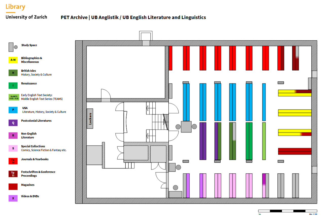 - 18 Schliessfächer (kostenlos, 28 Tage Ausleihe, Vormerkung möglich über swisscovery).