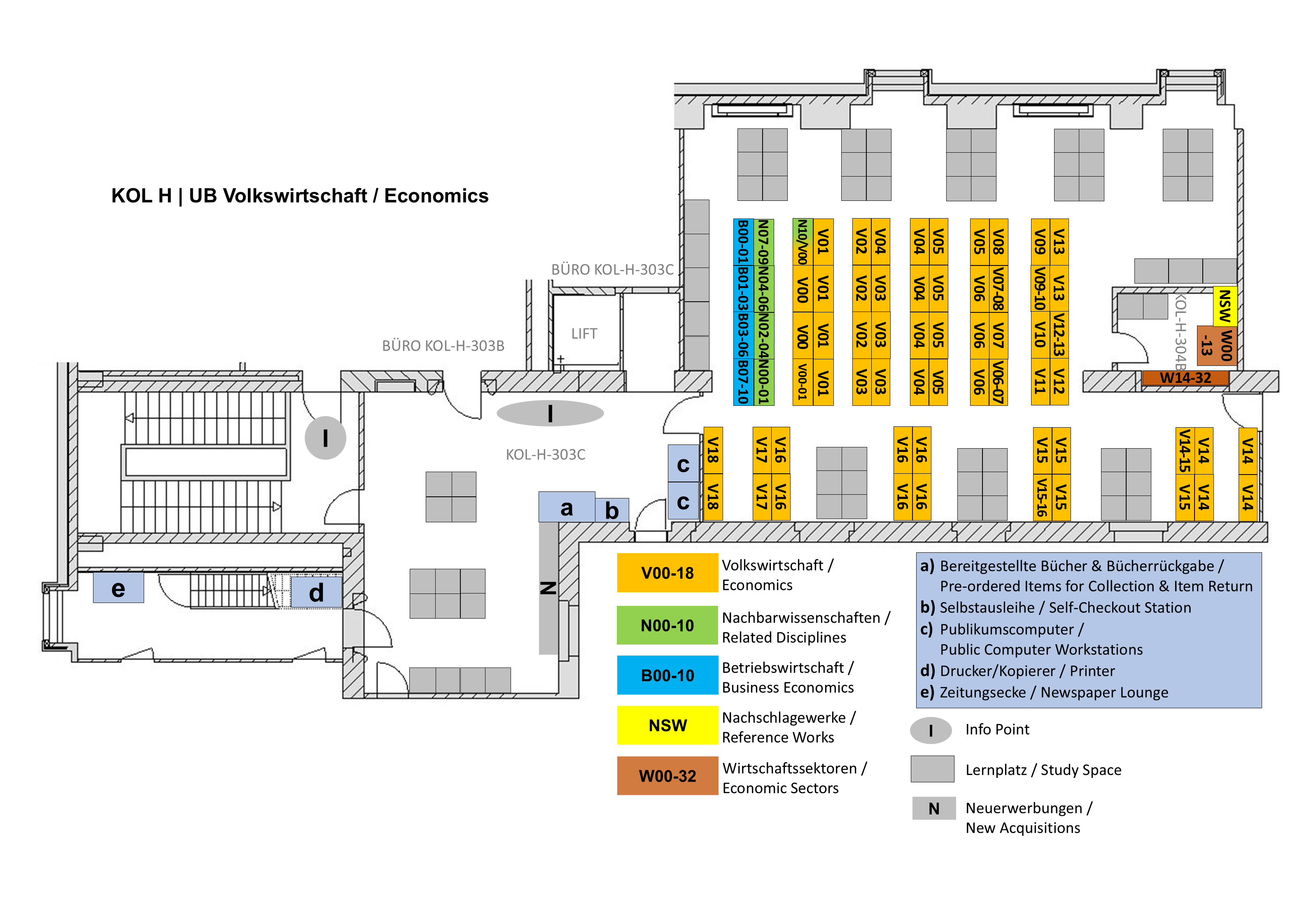 There are an open stacks and a closed stacks with about 75'000 mostly borrowable monographs and about 70 current journal titles. The collection basically covers the entire range of scientific textbooks and journals on modern economics.